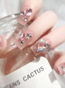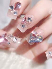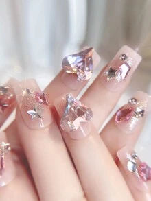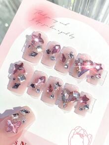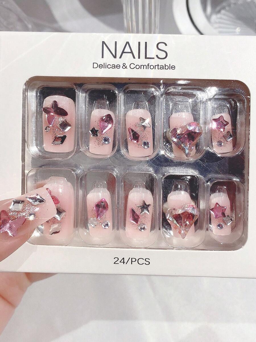 Fairycore 24pcs Long Square Rhinestone Decor Fake Nail & 1sheet Tape & 1pc Nail File