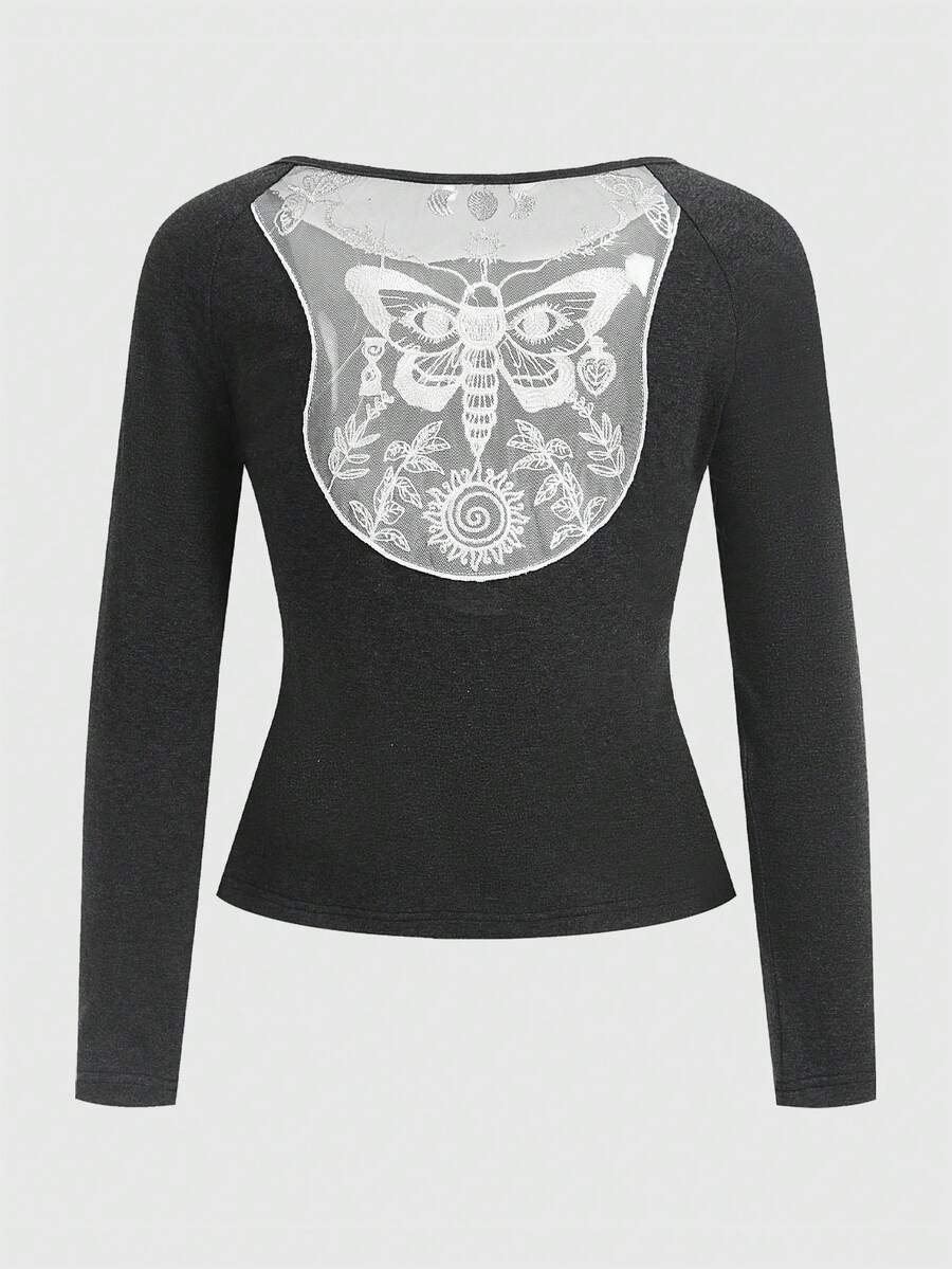 Fairycore Butterfly Graphic Contrast Lace Tee