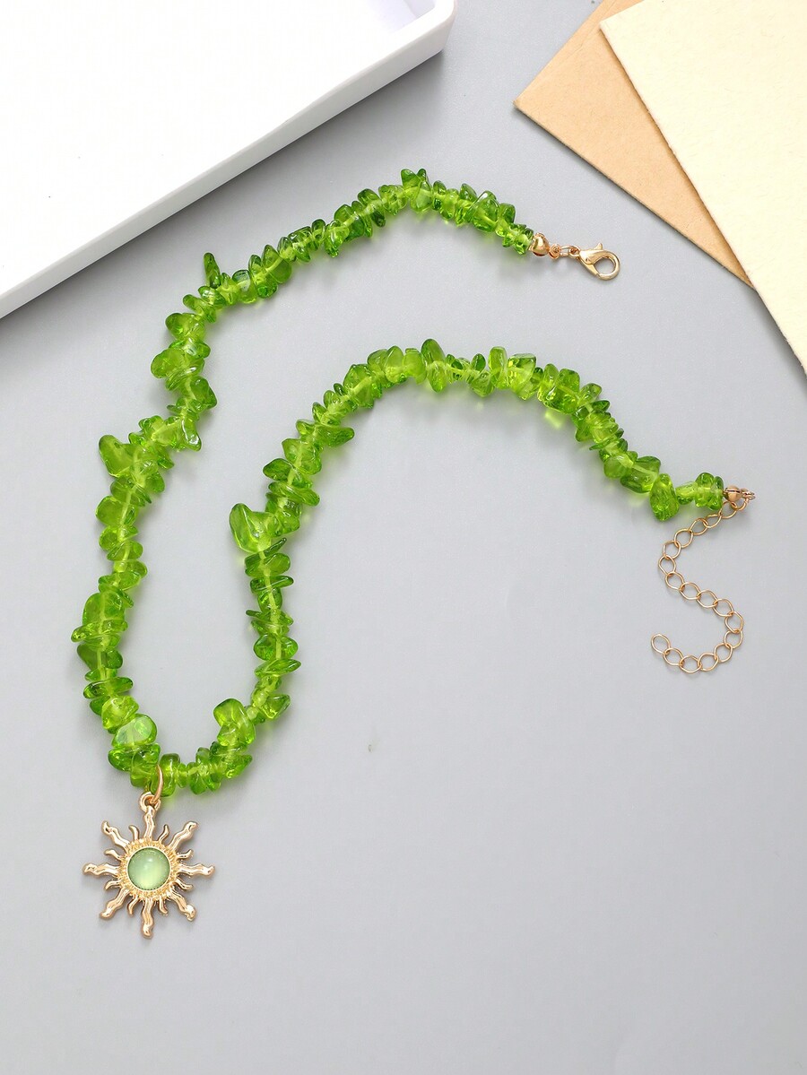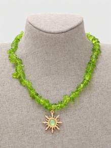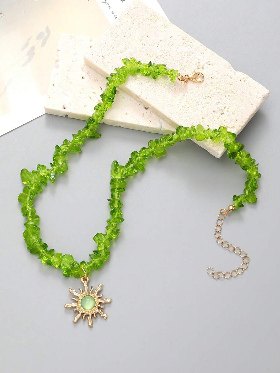 Fairycore Green Crystal Chips Gold-Tone Green Sunstone Pendant Necklace
