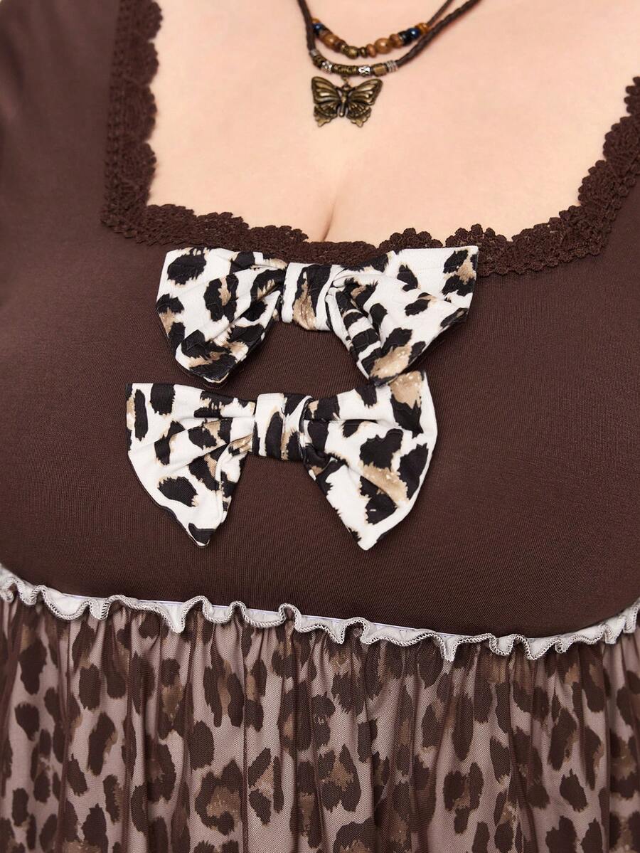 Fairycore Leopard Print Brown Mesh Bow Knit Long Sleeve Top, Plus Size Women Blouse, Casual Autumn/Winter
