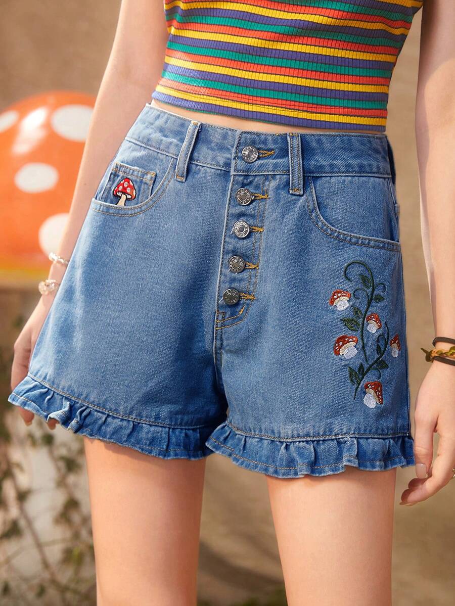 Fairycore Mushroom Embroidery Button Fly Ruffle Hem Denim Shorts