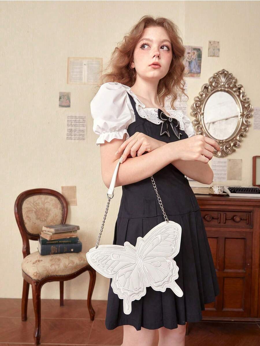 Fairycore PU Leather Embroidered Bow Decor Shoulder Bag, Commute, Party, Gift, Travel