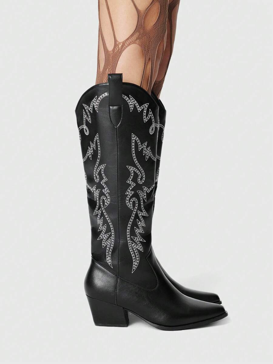 Fairycore Patterned & Embroidered Pointed Toe Low Heel Hippie Western Boots, PU Black Knee-High Cowgirl Boots For Daily Wear