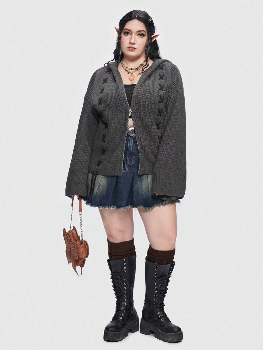 Fairycore Plus Lace Up Drop Shoulder Hooded Cardigan