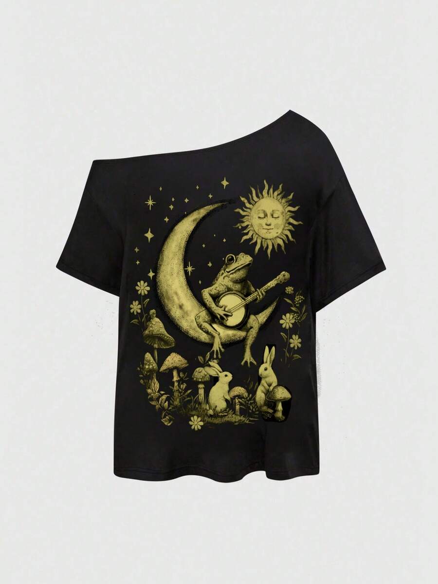 Fairycore Plus Size Mysterious Frog & Mushroom Graphic Basic Street Vintage Oblique Shoulder T-Shirt