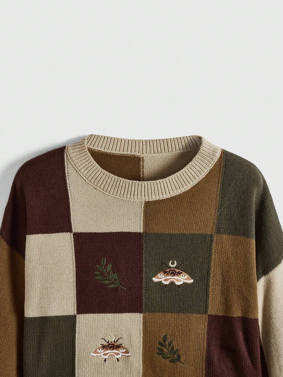 Fairycore Plus Size Women's Butterfly Embroidery Contrast Color Checkerboard Sweater