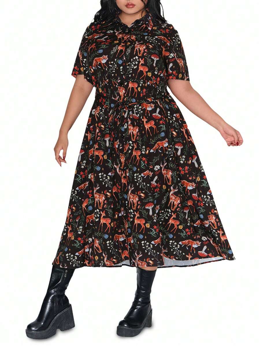 Fairycore Plus Size Women's Summer Retro Countryside Cottagecore Deer & Floral Print Dress