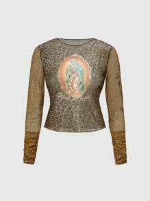 Fairycore Plus Size Women's Y2K Vintage Religious Virgin Mary Leopard Print Sheer Fitted Top