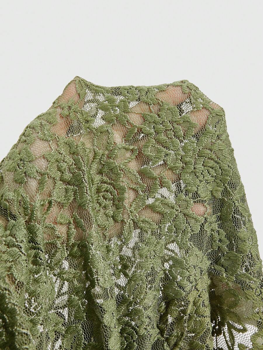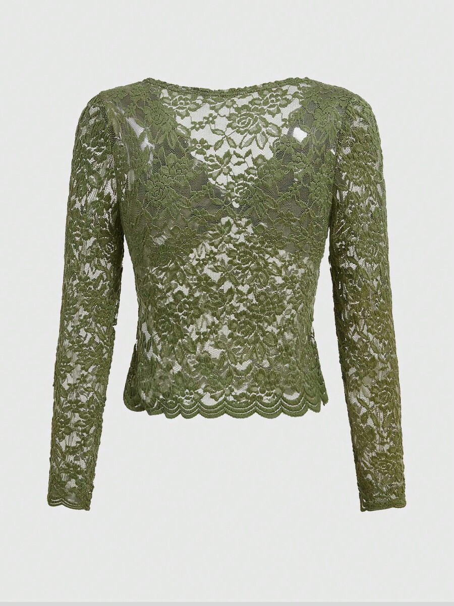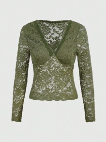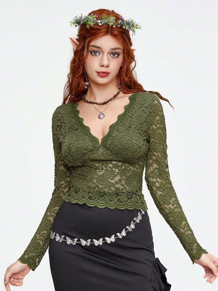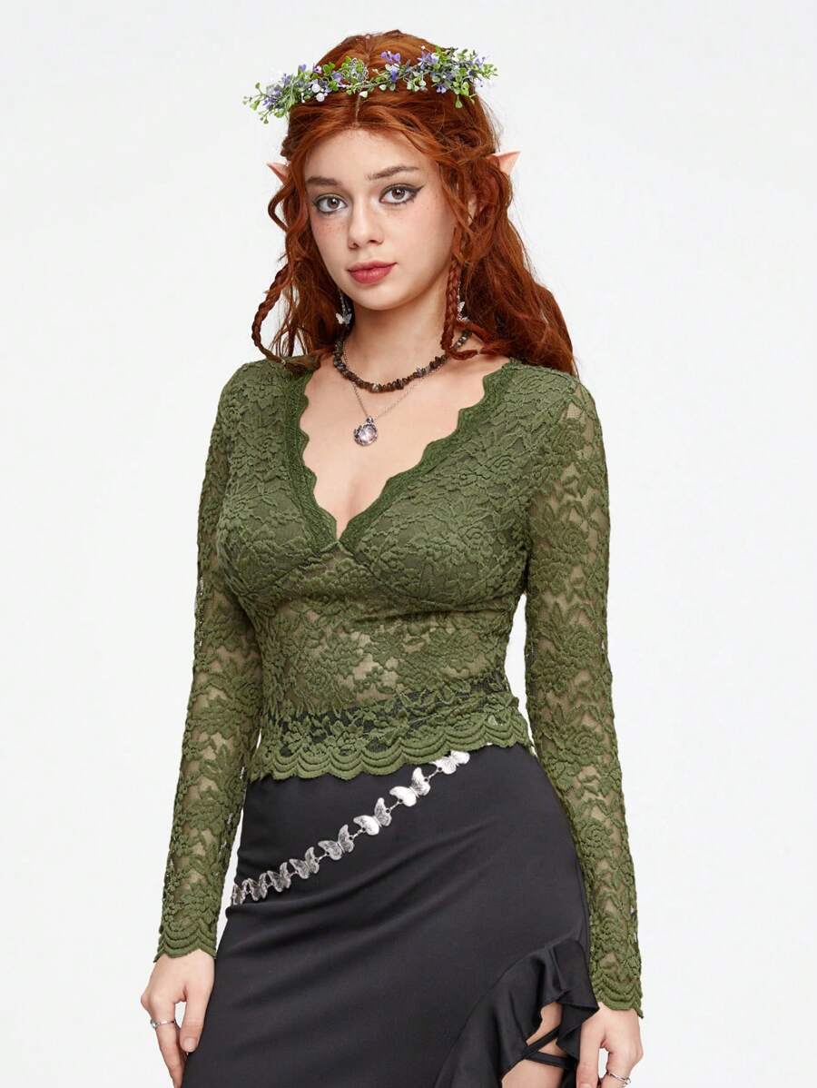 Fairycore Rose Lace Deep V-neck Slim Fit Women's Top In Green