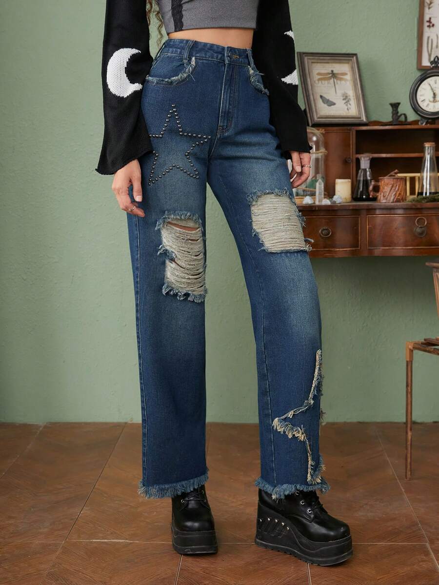Fairycore Star Pattern Ripped Raw Hem Wide Leg Jeans