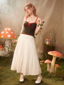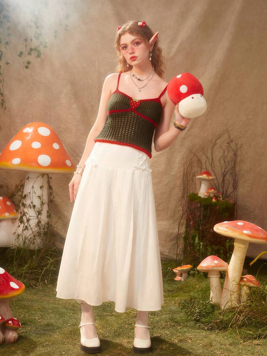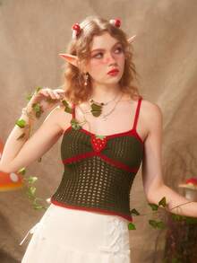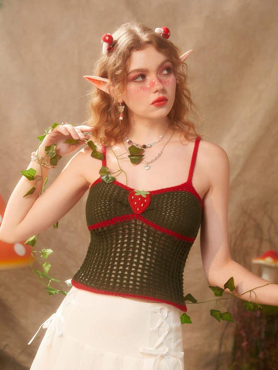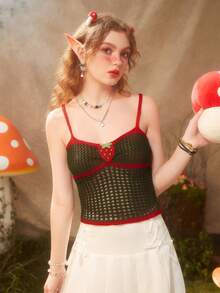 Fairycore Strawberry Embroidery Contrast Binding Hollow Out Knit Top