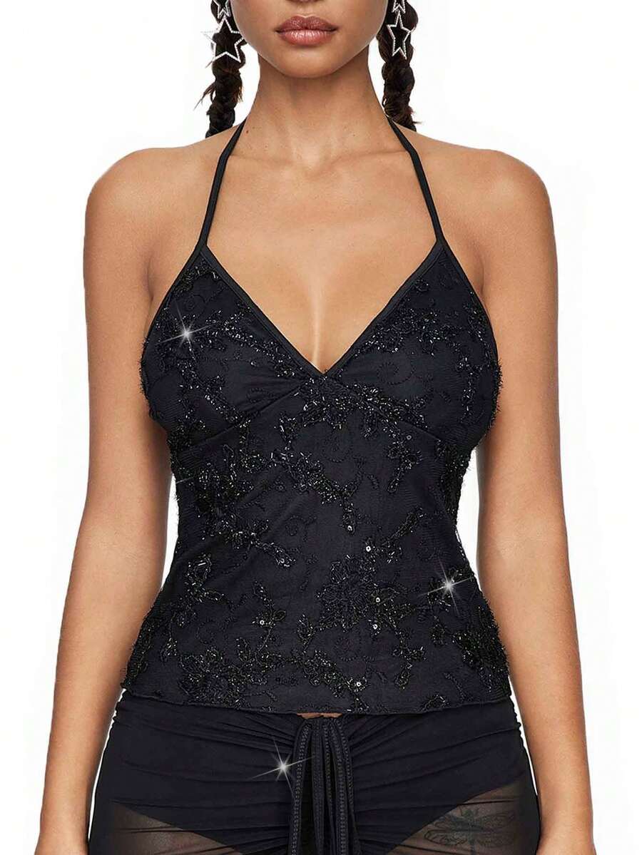 Fairycore Summer Fashion Mesh Sequin Embroidered Floral Vine Halter Top