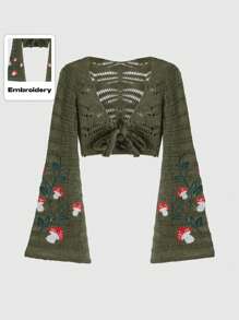 Fairycore Summer Mushroom Embroidery Tie Front Crochet Cardigan, School