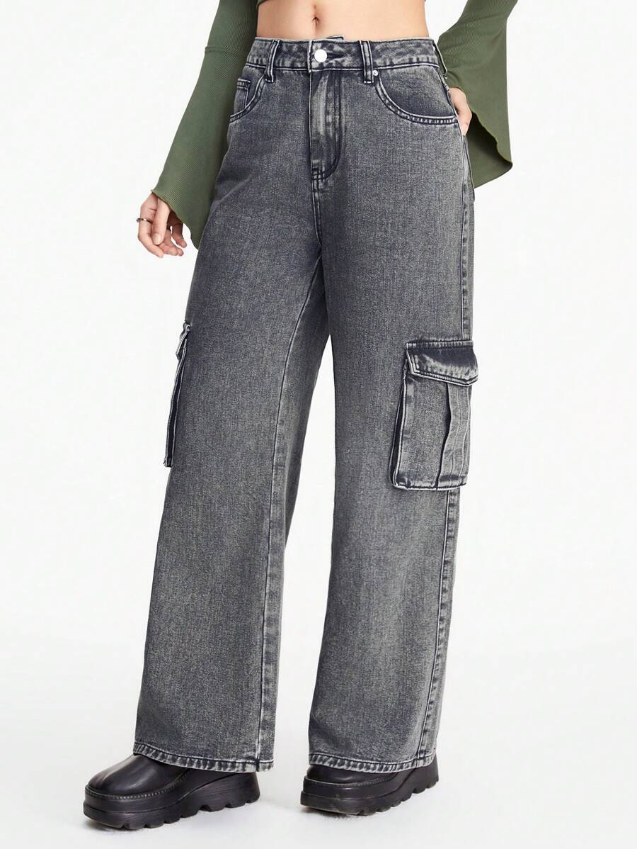 Fairycore Women Casual Front Button Multi Pocket, Wing Print Denim Jeans