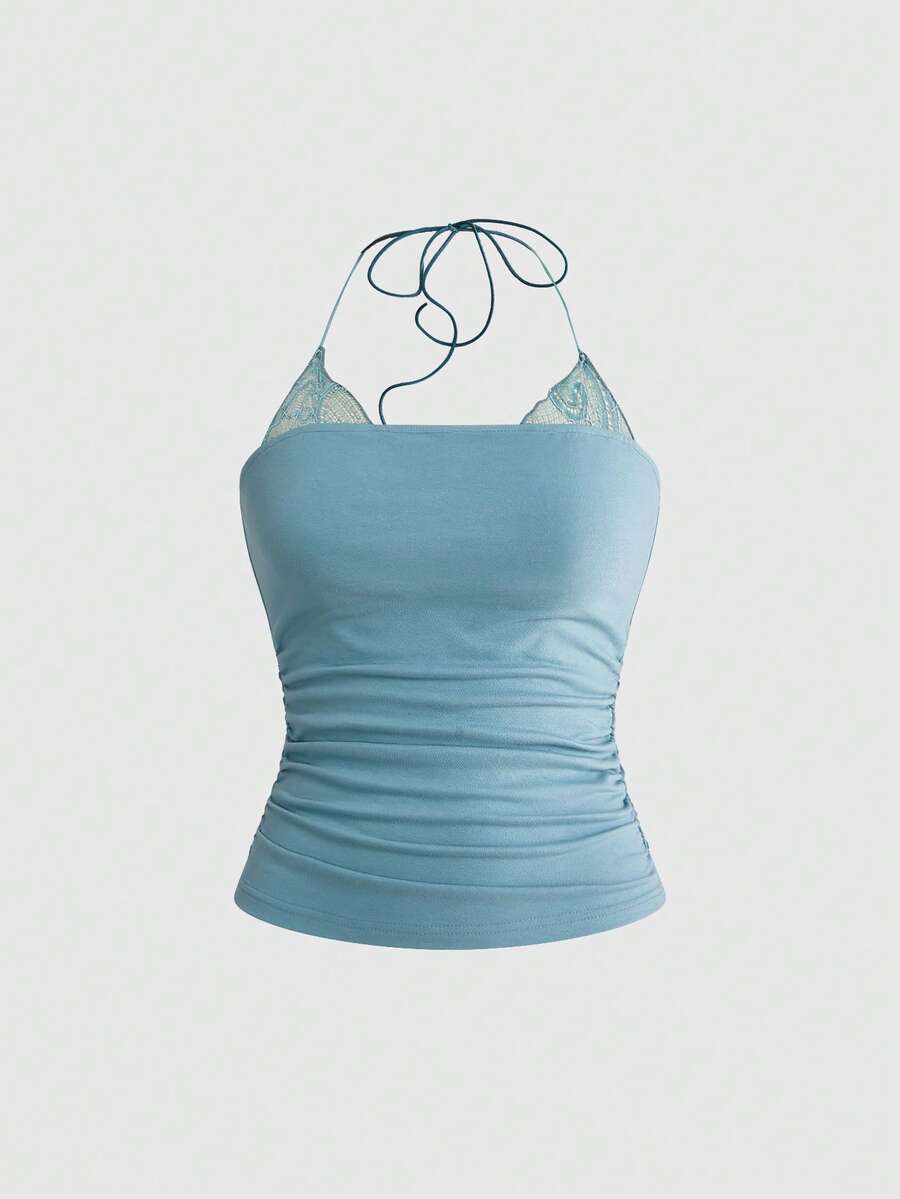 Fairycore Women's Basic 2 In 1 Lace Trim Halter Neck Pleated Camisole