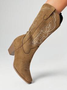 Fairycore Women's Cowboy Boots, Brown Outdoor Casual Fashion Slip-On Embroidered Western Mid-Calf Boots, Spring/Autumn New Arrival