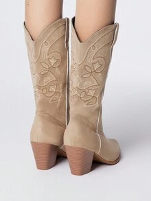Fairycore Women's Cowboy Boots, Khaki Outdoor Casual Fashion Slip-On Embroidered Faux Suede Western Boots, Mid-Calf, Spring/Autumn
