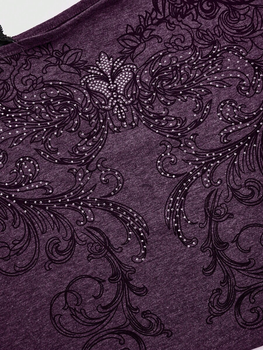 Fairycore Women's Loose Floral Print Lace Splice Rhinestone Decorated Asymmetrical Neck Short Tee