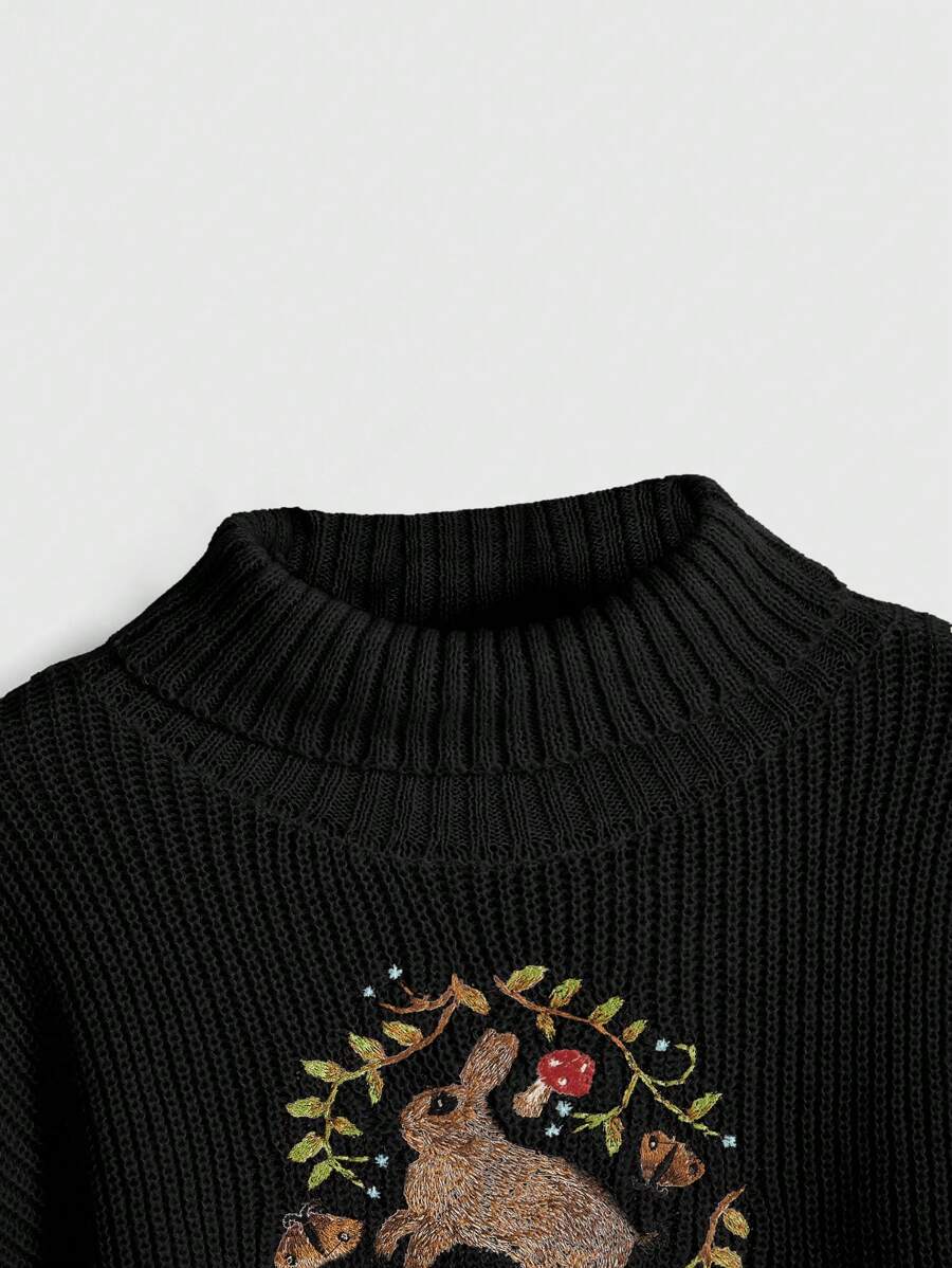 Fairycore Women's Short Deer & Mushroom Embroidery Turtleneck Sweater