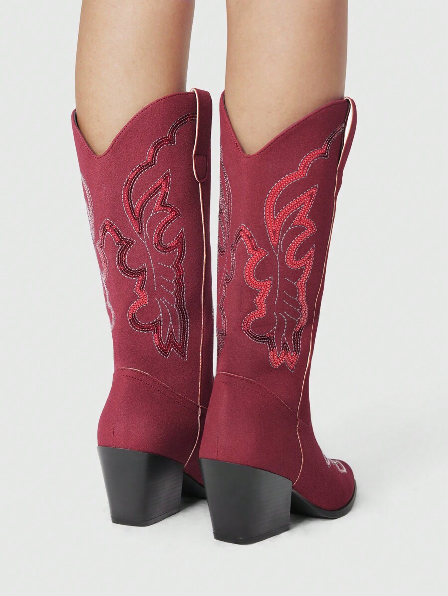 Fairycore Women's Spring/Autumn New Burgundy Outdoor Casual Fashion Embroidered Sequin Western Cowboy Boots, Mid-Calf Cowgirl Boots