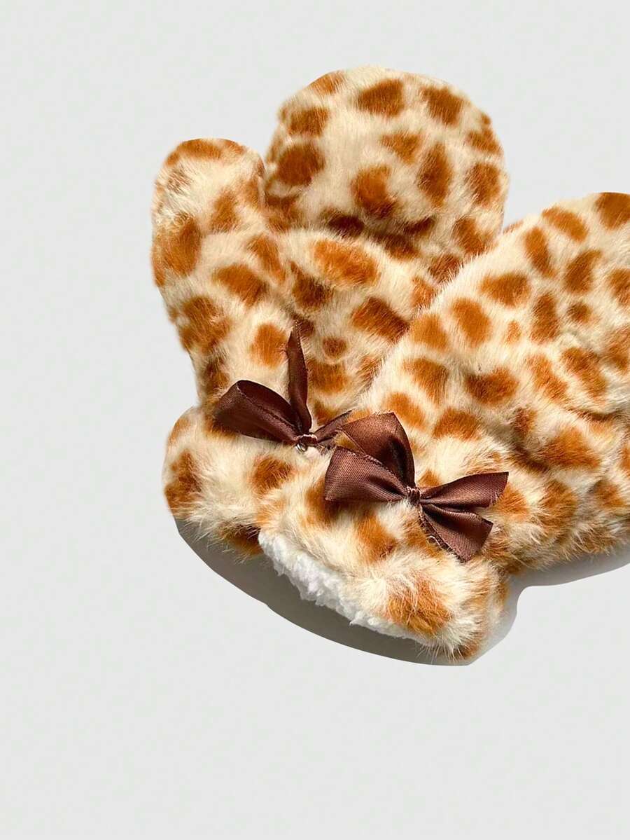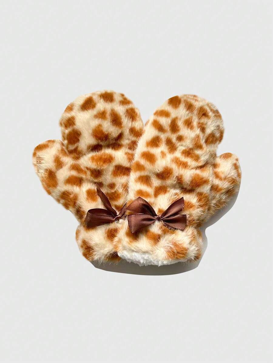Fairycore Y2K Cute Deer Pattern Faux Fur Gloves Double-Layer Bowknot Gloves Women's Winter Fashion Gloves