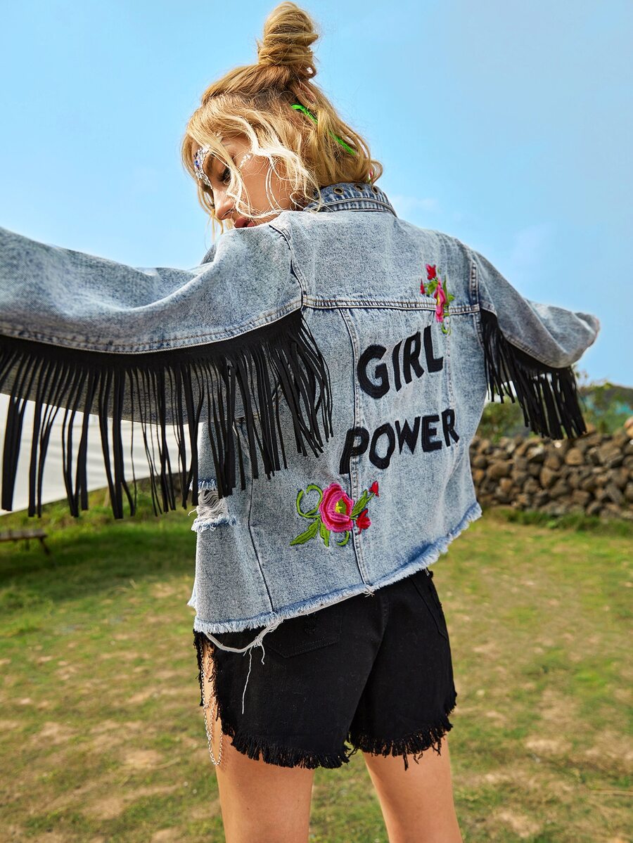 Floral Embroidery Fringe Denim Jacket