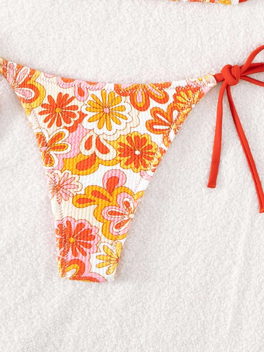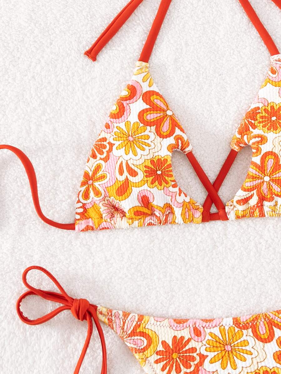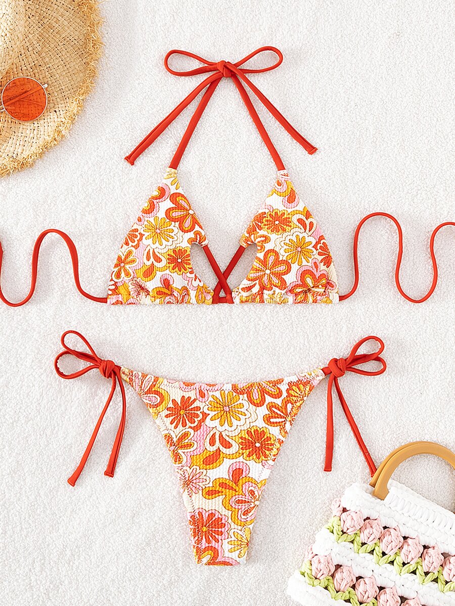 Floral Print Bikini Set Crisscross Halter Triangle Bra & Thong Bottom 2 Piece Bathing Suit
