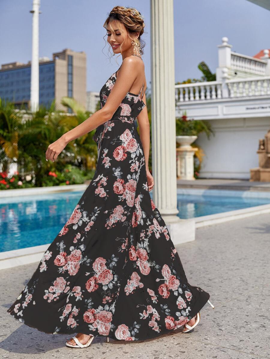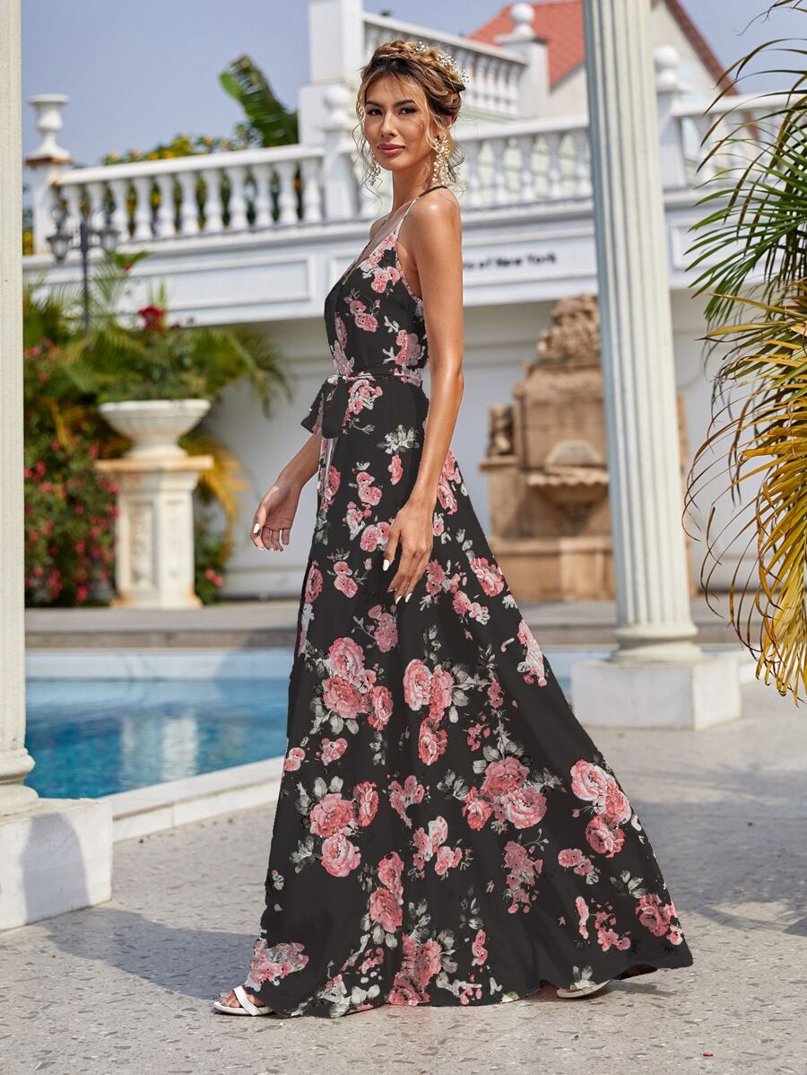 Floral Print Surplice Belted Dress