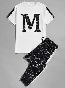 GENTILAND Men Geo Letter Graphic Short Sleeve Top & Striped Side Joggers Pants Set, Going Out