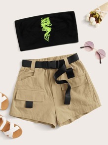 Girls Dragon Bandeau Top and Push Buckle Belted Shorts Set