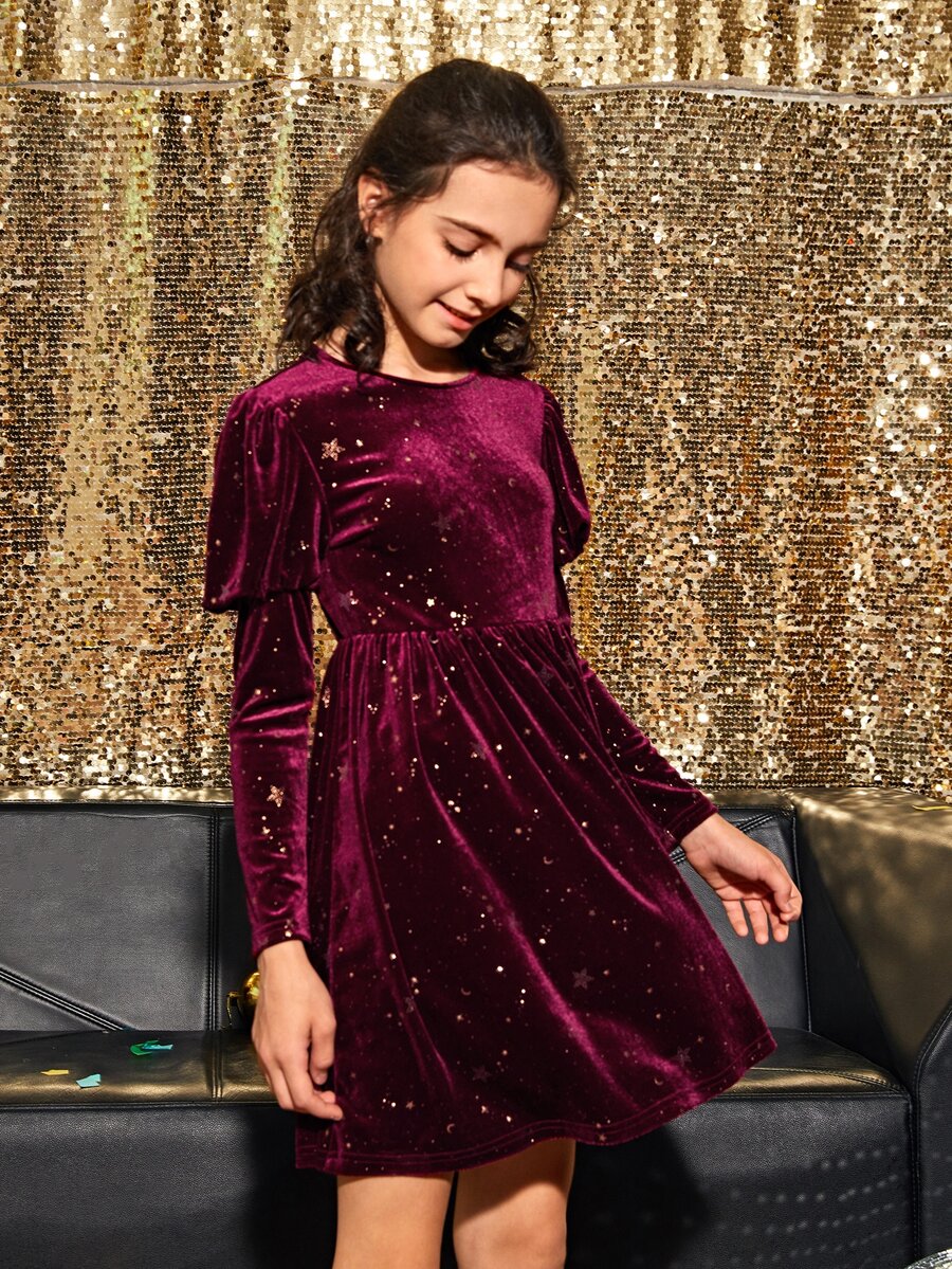 Girls Gigot Sleeve Glitter Galaxy Velvet Dress
