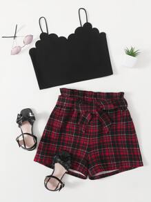 Girls Scallop Edge Crop Cami Top & Paperbag Waist Belted Tartan Shorts Set