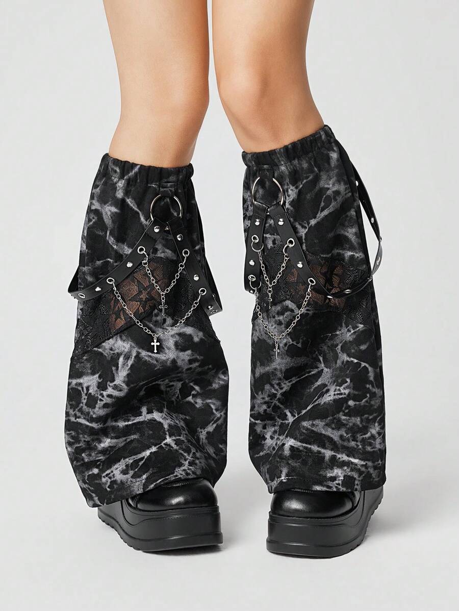 Goth 1 Pair Black Tie-Dye Flare Leg Gaiters With Chain, Y2K Punk Style Metal Strap Leg Warmers, And Versatile Daily Wear