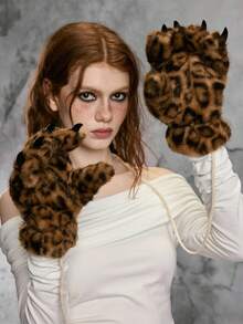 Goth 1 Pair Y2K Retro Furry Leopard Print Claw Gloves, Fashionable & Minimalist, Suitable For Performance, Party, Gathering, Autumn/Winter