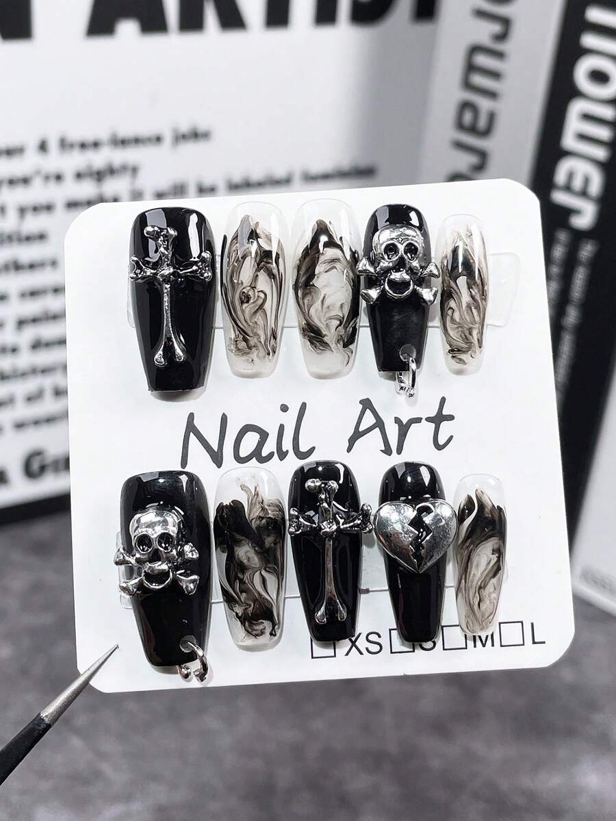 Goth 10pcs 3d Cross, Skull, Heart Decorated False Nail Set