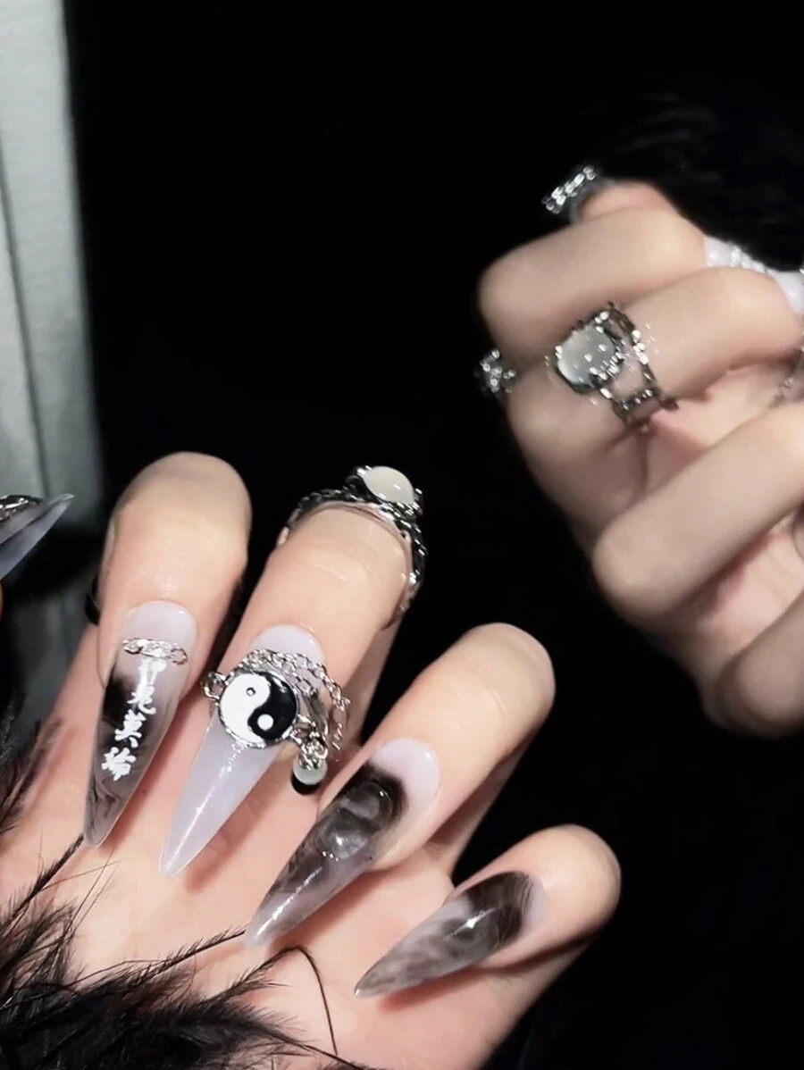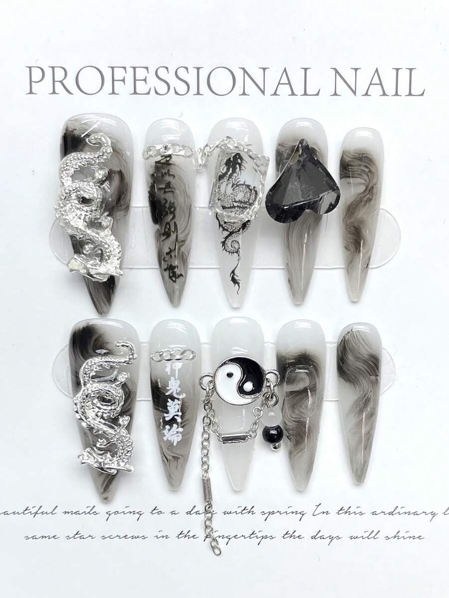Goth 10pcs Chinese Dragon & Chain Decor Fake Nails