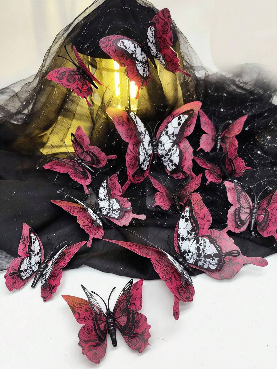 12pcs/Set Skull Rose 3D Butterfly Wall Sticker Gothic Home Decoration Set Of 12 Reusable And Detachable Stickers For Living Room And Bedroom Decoration, Halloween