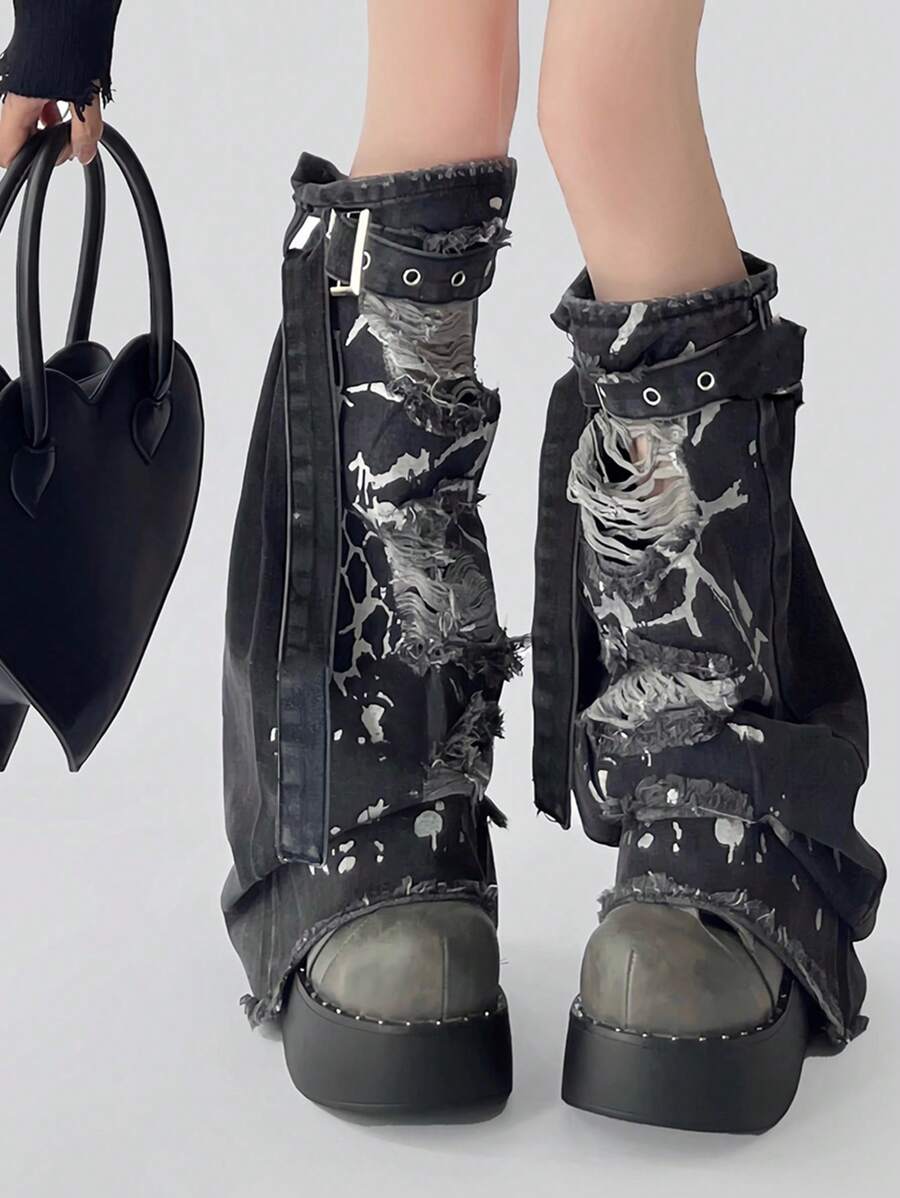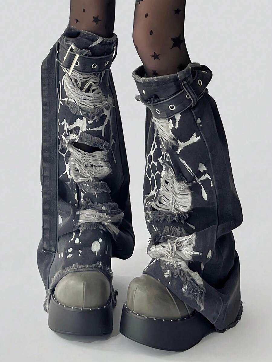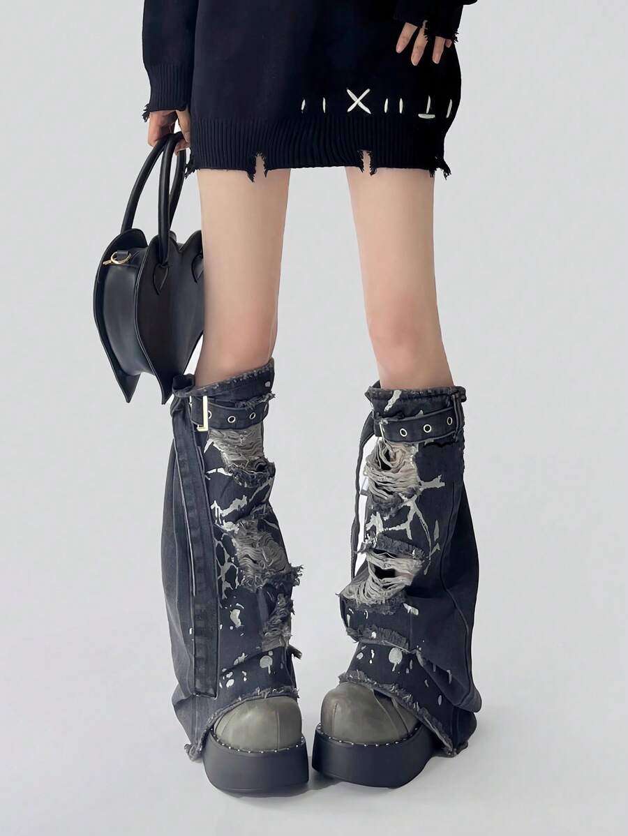 Goth 1pair Distressed Denim Leg Warmers With Wasteland Style Design