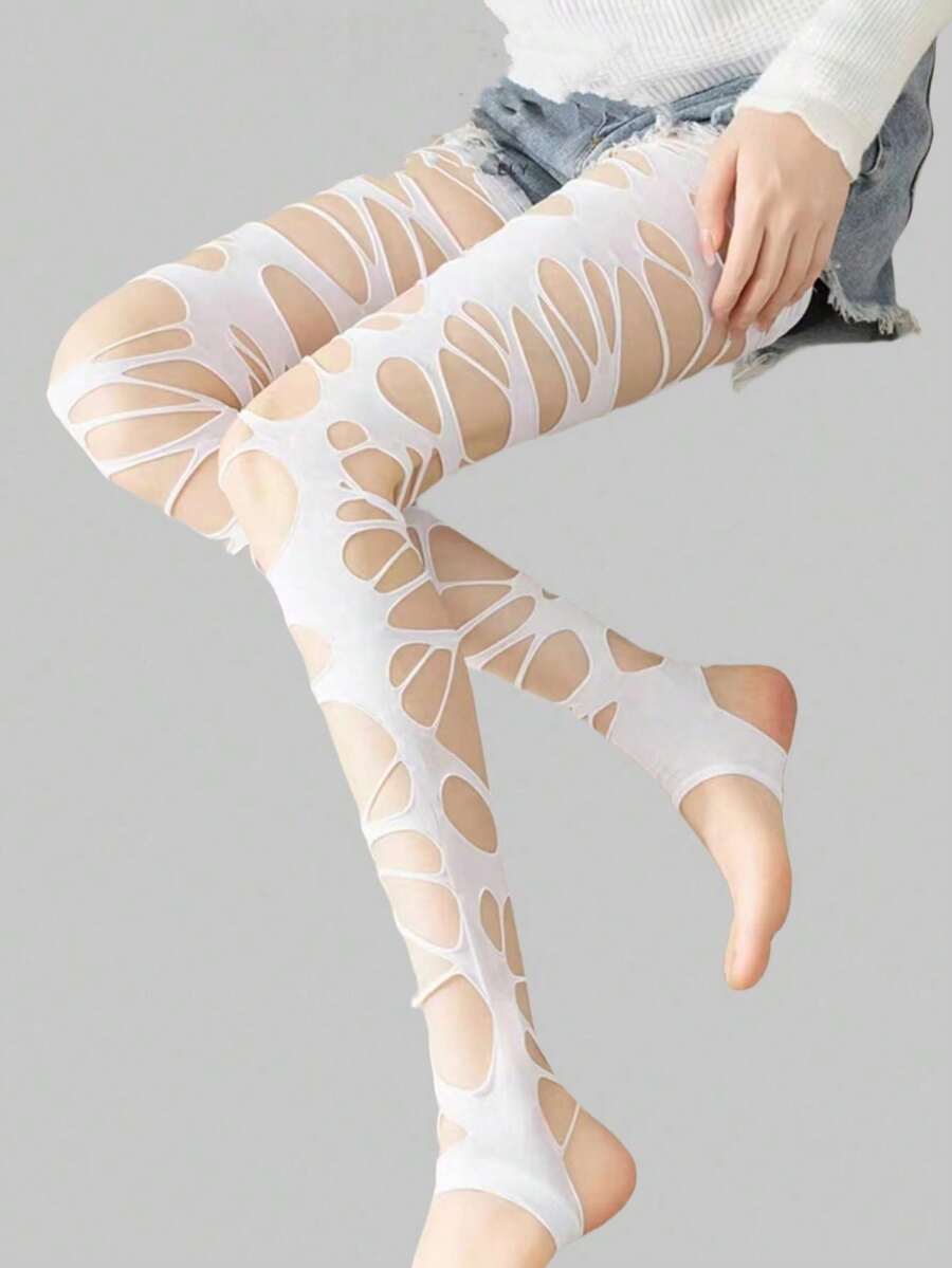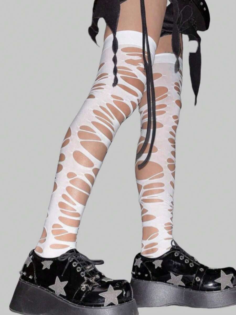 Goth 1pair White All-Season Women Black Ripped Knee High Socks