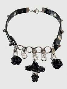 Goth 1pc Black Leather Zipper Cross & Rose Pendant Choker