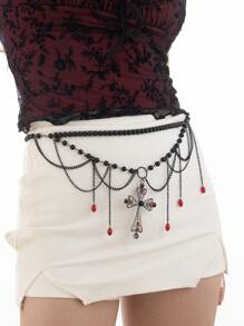 Goth 1pc Fashionable Punk Crystal Cross Tassel Beaded Waist Chain Belt For Women, Halloween Party Costume