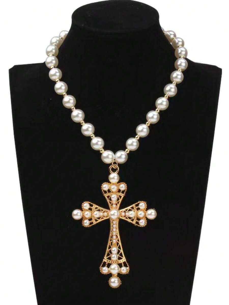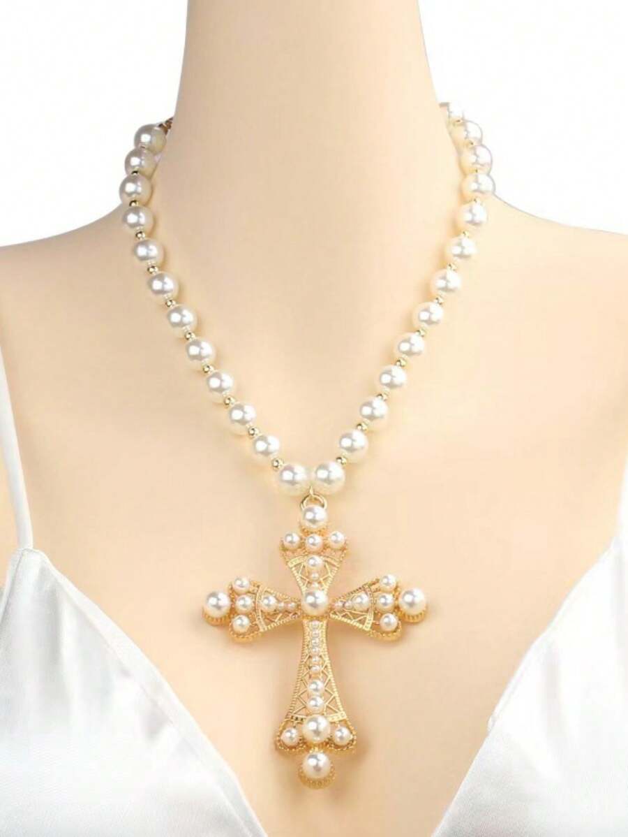 Goth 1pc Faux Pearl & Bead Cross Pendant Necklace Suitable For Sending To Friends