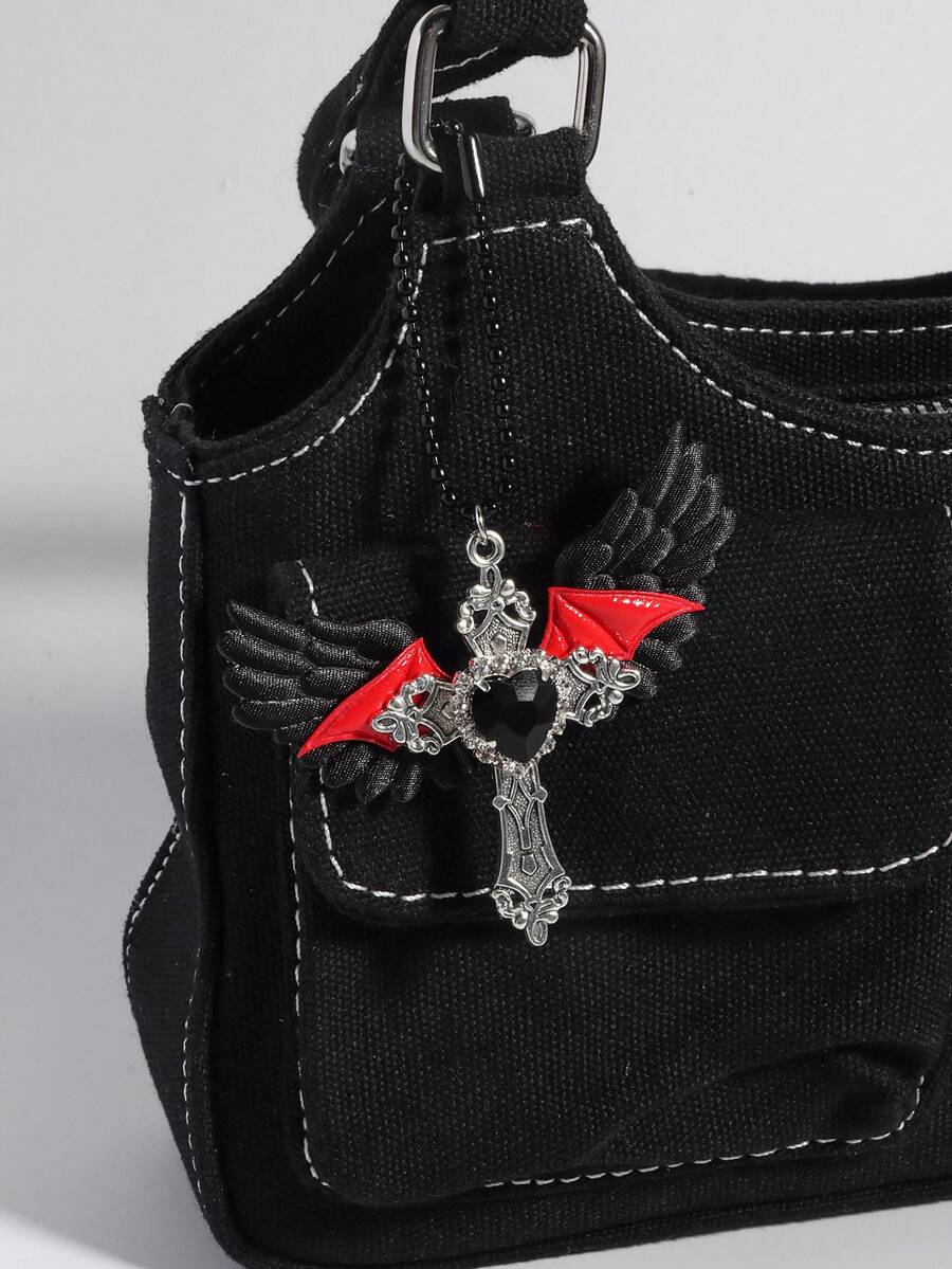 1pc Gothic Black Zirconia Heart Shaped Bag Charm, Cross Wing Phone Lanyard Keychain Pendant