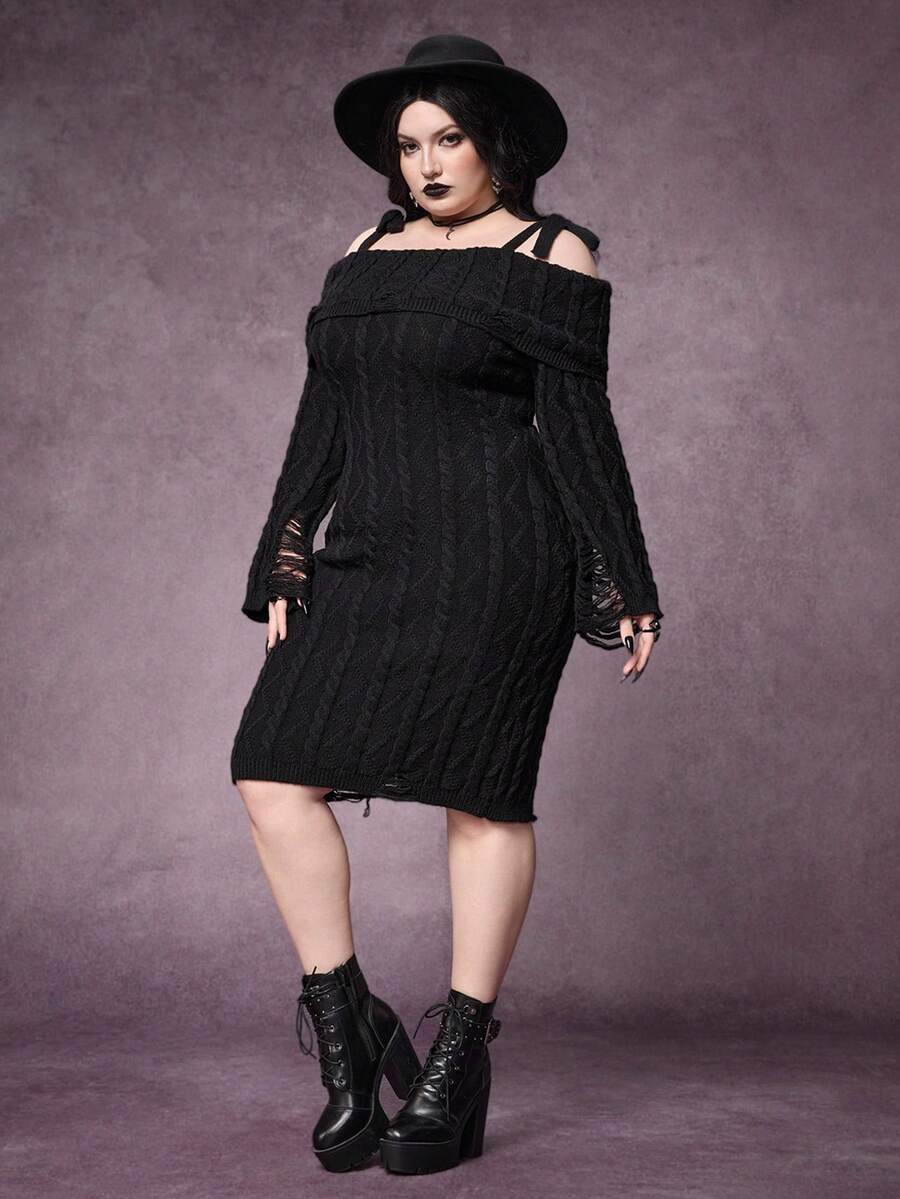 Goth 1pc Plus Size Women Shoulder Ripped Design Shoulder Strap Bodycon Dress/Winter