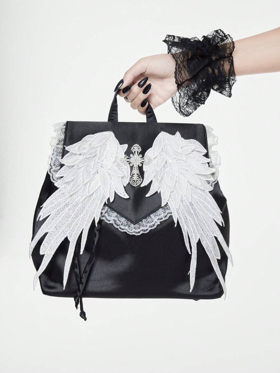 Goth 1pc White Angel Wings With Rhinestone Cross Lace Decor Backpack