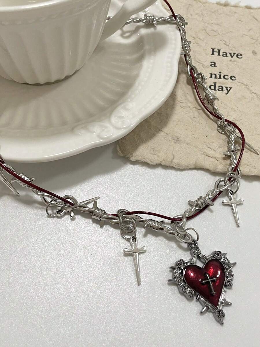 Goth 1pc Women's Sweet & Edgy Double Layer Cross & Heart Pendant Choker Necklace
