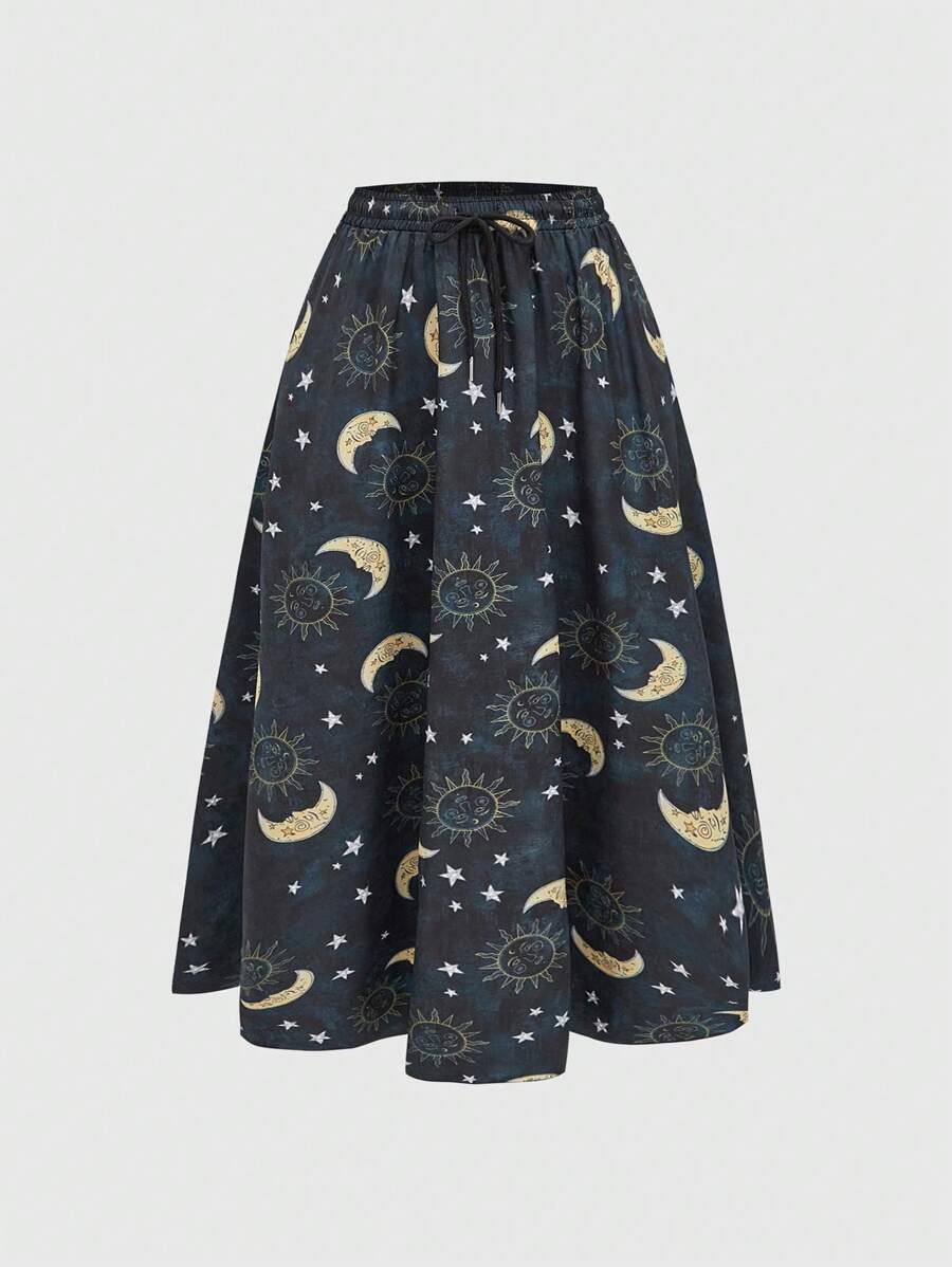 2pcs/Set Plus Size Women Gothic Plant Print Sleeveless Elastic Waist Skirt And Tank Top Resort Outfit