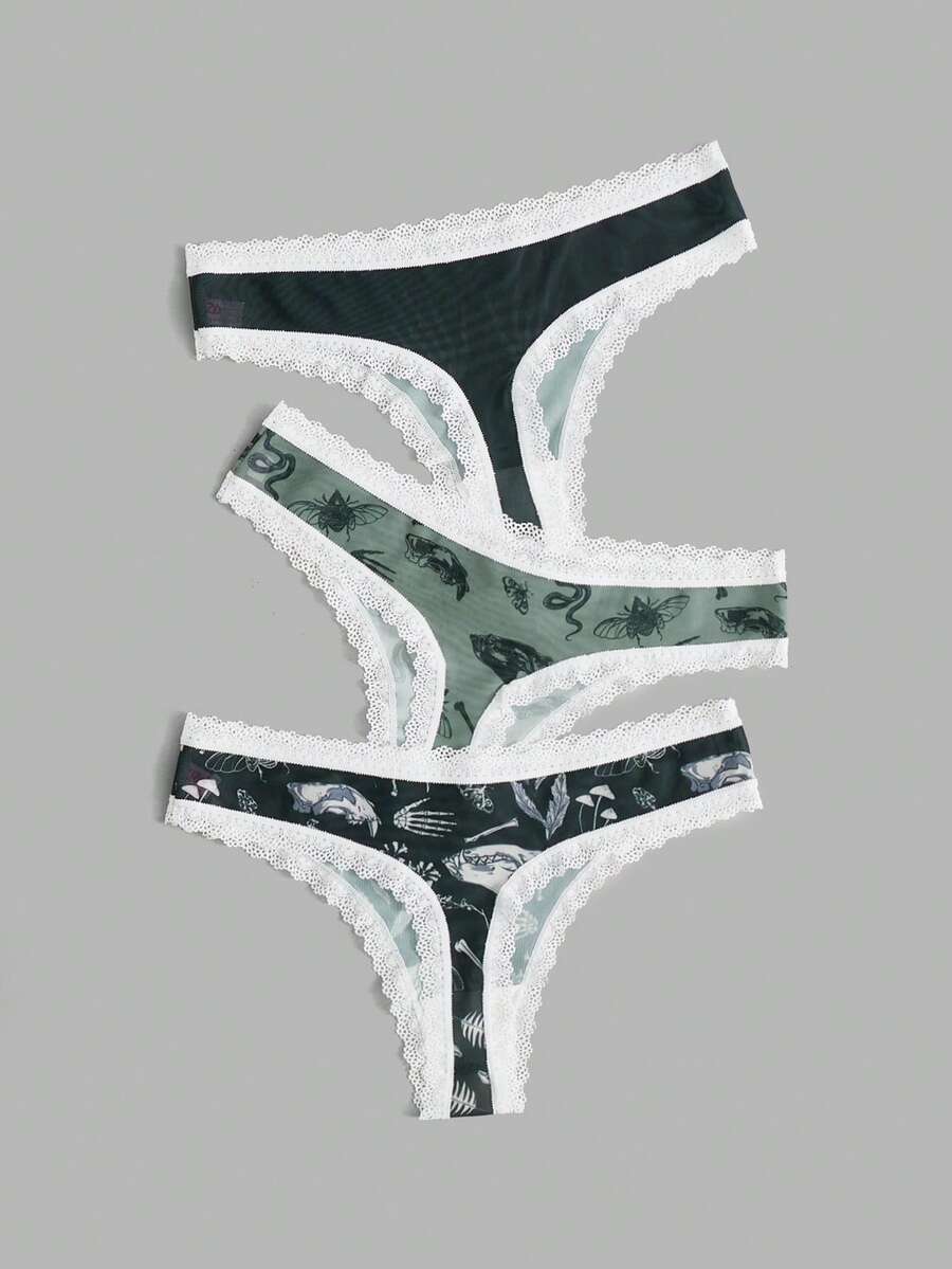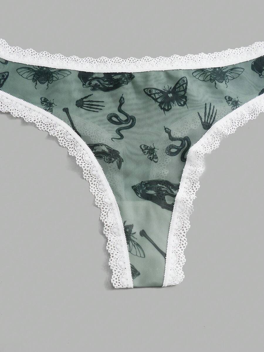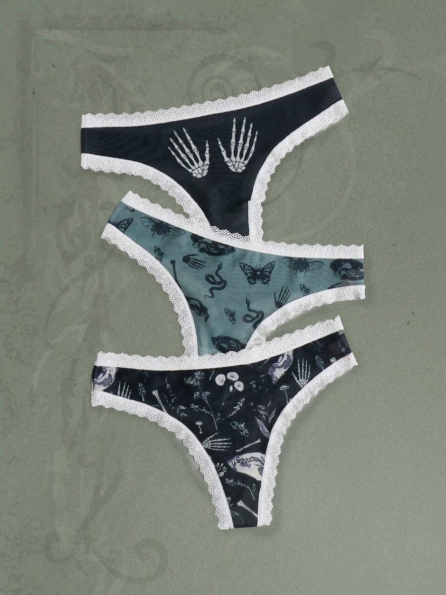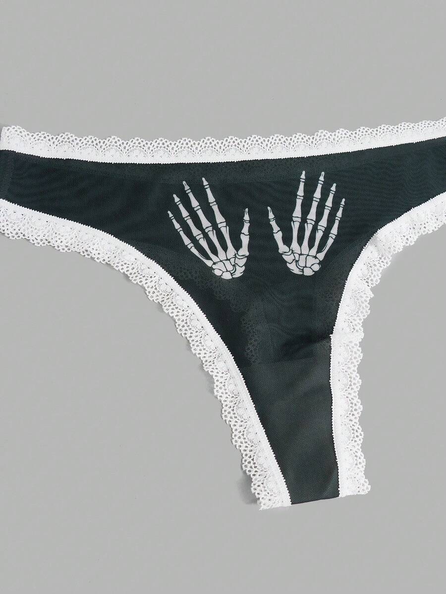 Goth 3pack Skeleton Hand Print Contrast Lace Panty Set