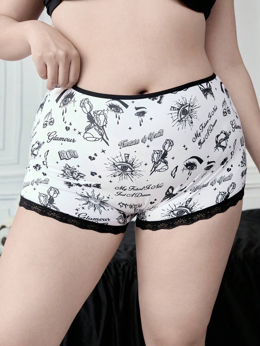 3pcs/Set Gothic Plus Size Lace Trim Panties With Mushroom, Butterfly, Rose, Skull & Cross Print Designs