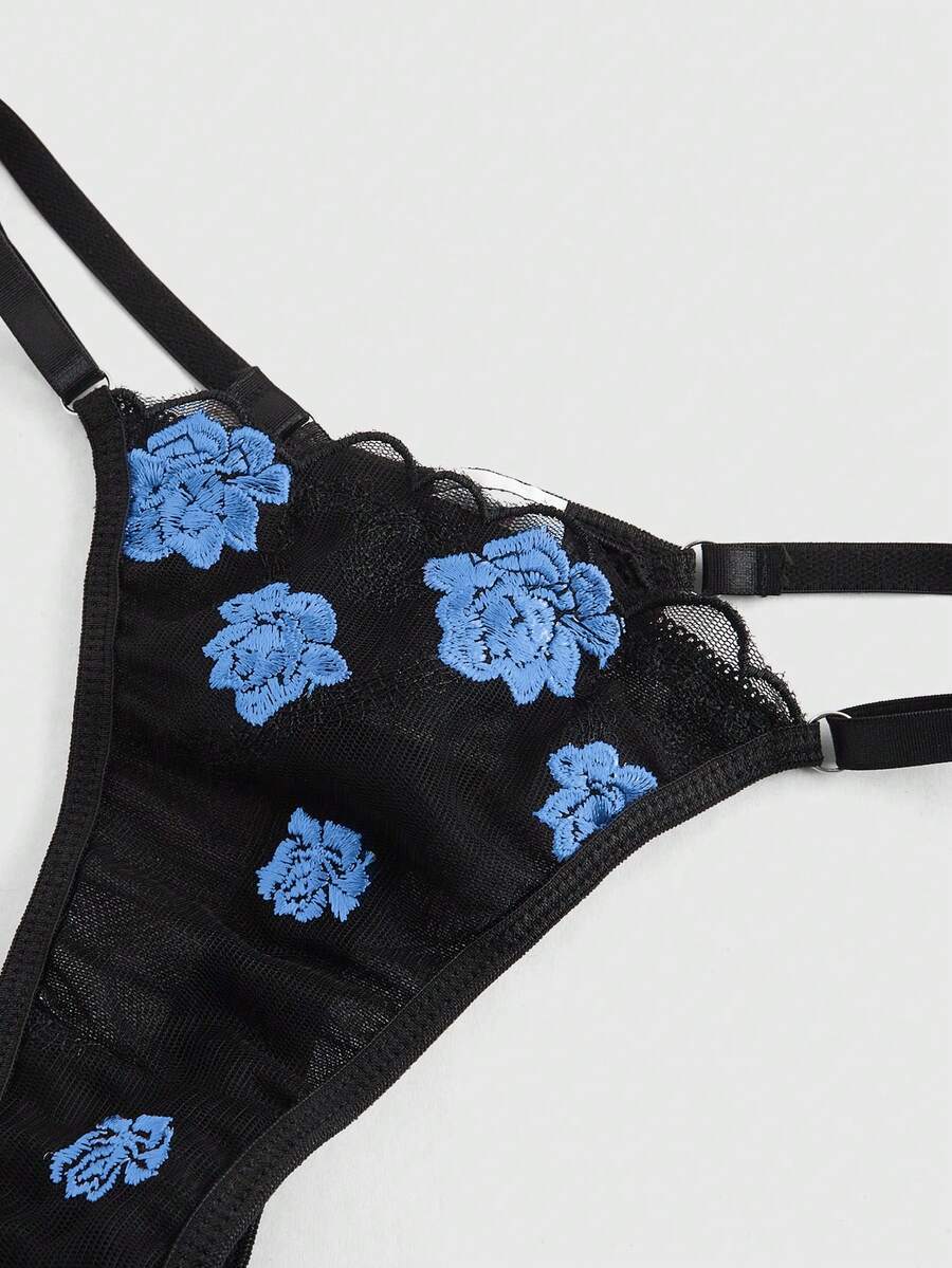 Goth 3pcs Set Sexy Lingerie Outfit, Including Underwire Garter Belt Bra, Rose Flower Decor Thong